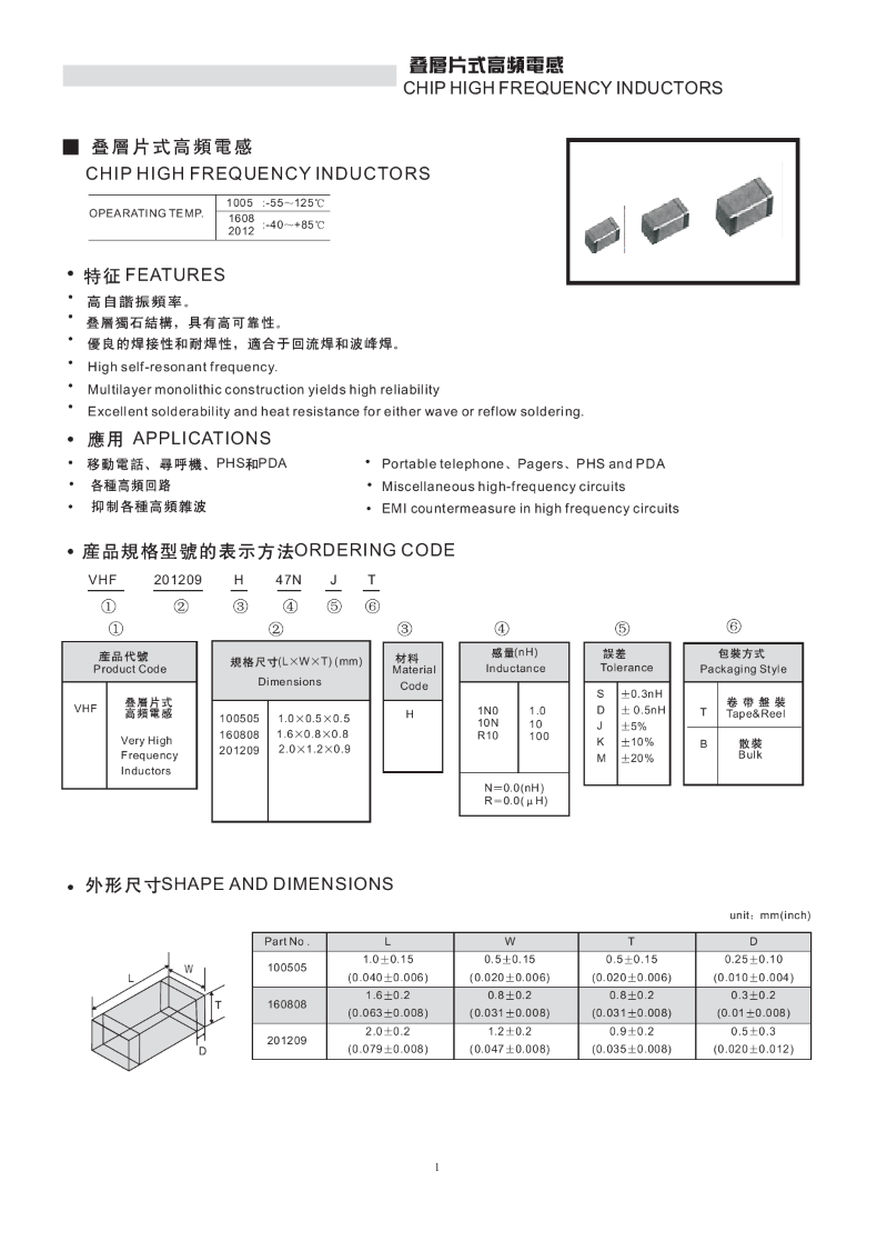 代理風華電感VHF060303HQ0N9ST貼片電感0201 ±0.3nH 0.9NH高頻電感S檔 550mA電流